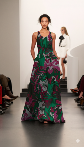 Step into the spotlight with this statement floral maxi dress — where elegance meets artistic charm. Crafted from premium fabric, this dress features a stunning mix of deep green, violet,...