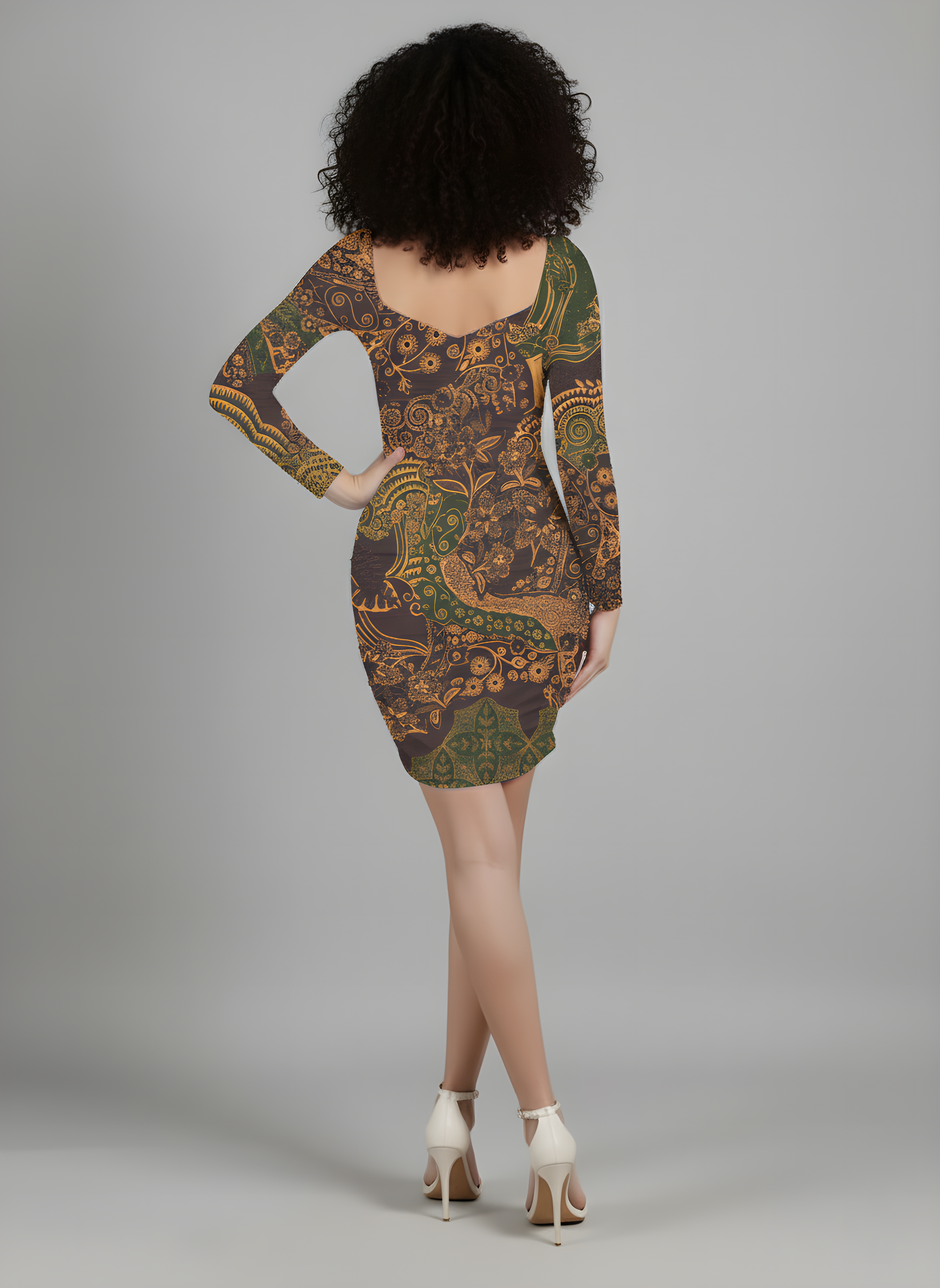 Make a statement in our Boho Luxe Printed Bodycon Dress, where bold artistry meets timeless sophistication. Featuring intricate ethnic-inspired motifs in earthy brown, gold, and olive tones, this dress embodies a perfect balance of elegance and modern edge.